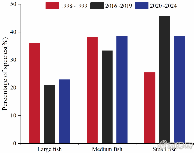 该研究采用延绳钓、手钓、流刺网、潜水捕捞、eDNA等多种调查方法,整合1998-2019年的历史调查数据和2020-2024年的现场调查数据,系统分析了美济礁珊瑚礁鱼类群落结构的长期演变特征。截至2024年,在美济礁共记录珊瑚礁鱼类353种,隶属14目61科162属。鱼类群落以小型鱼类(43.81%)和肉食性鱼类(74.92%)为主;大型肉食性鱼类物种数比例较1998-1999年的水平显著下降,小型肉食性鱼类比例明显增加,且肉食性鱼类整体平均体长与体重显著降低;不同时期之间肉食性鱼类物种的相似性系数较低,均表现为“极不相似”或“不相似”,反映出群落组成显著更替。与2016-2019年相比,2020-2024年期间大型肉食性鱼类以及珊瑚礁依赖程度较高的鮨科等类群的物种占比明显回升;与之相反,小型肉食性鱼类及对活珊瑚依赖程度较低的羊鱼科等类群的占比则显著下降,这种变化趋势显示出美济礁2019年生态修复后鱼类资源正逐步恢复。珊瑚礁鱼类群落长期监测能更加全面揭示区域鱼类演替规律,对推动珊瑚礁生态系统的健康与恢复具有重要指导意义。